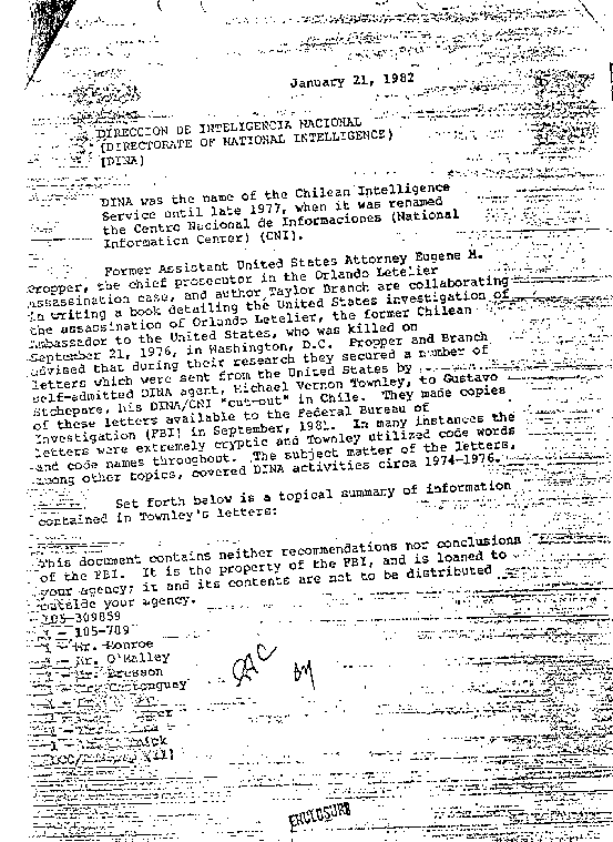Former Assistant United States Attorney Eugene M. Propper, the chief prosecutor in the Orlando Letelier assassination case, and author Taylor Branch are collaborating in writing a book detailing the United States investigation of the assassination of Orlando Letelier, the former Chilean Ambassador to the United States, who was killed on September 21, 1976, in Washington, D.C. Propper and Branch advised that during their research they secured a number of letters which were sent from the United States by self-admitted DINA agent, Michael Vernon Townley, to Gustavo Etchepare, his DINA/CNI "cut-out" in Chile. They made copies of these letters available to the Federal Bureau of Investigation (FBI) in September, 1981. In many instances the letters were extremely cryptic and Townley utilized code words and code names throughout. The subject matter of the letters, among other topics, covered DINA activities circa 1974-1976.