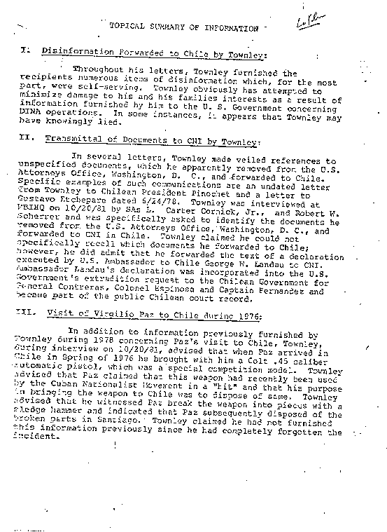 In several letters, Townley made veiled references to unspecified documents, which he apparently removed from the U.S. Attorneys Office, Washington, D.C., and forwarded to Chile. Specific examples of such communications are an undated letter from Townley to Chilean President Pinochet and a letter to Gustavo Etchepare dated 6/24/78. Townley was interviewed at FBIHQ on 10/20/81 by SAs L. Carter Cornick, Jr., and Robert W. Scherrer and was specifically asked to identify the documents he removed from the U.S. Attorneys Office, Washington, D.C., and forwarded to CNI in Chile. Townley claimed he could not specifically recall which documents he forwarded to Chile; however, he did admit that he forwarded the text of a declaration executed by U.S. Ambassador to Chile George W. Landau to CNI. Ambassador Landau's declaration was incorporated into the U.S. Government's extradition request to the Chilean Government for General Contreras, Colonel Espinosa and Captain Fernandez and became part of the public Chilean court record.