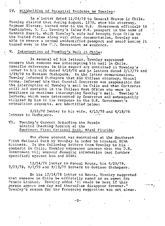 In the other letters to Etchepare, listed above, Townley indicated that the Prosin Limited account would disclose checks reflecting payments to fugitive Virgilio Paz's wife. In addition, Townley also claimed that information contained in the Prosin Limited account might lead to the discovery of the whereabouts of fugitives Virgilio Paz and Jose Dionioso Suarez. Townley also expressed concern that information in the Prosin Limited account would lead to the discovery of details regarding "Project Andrea."