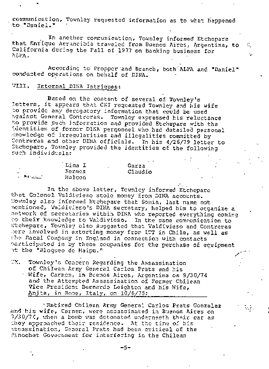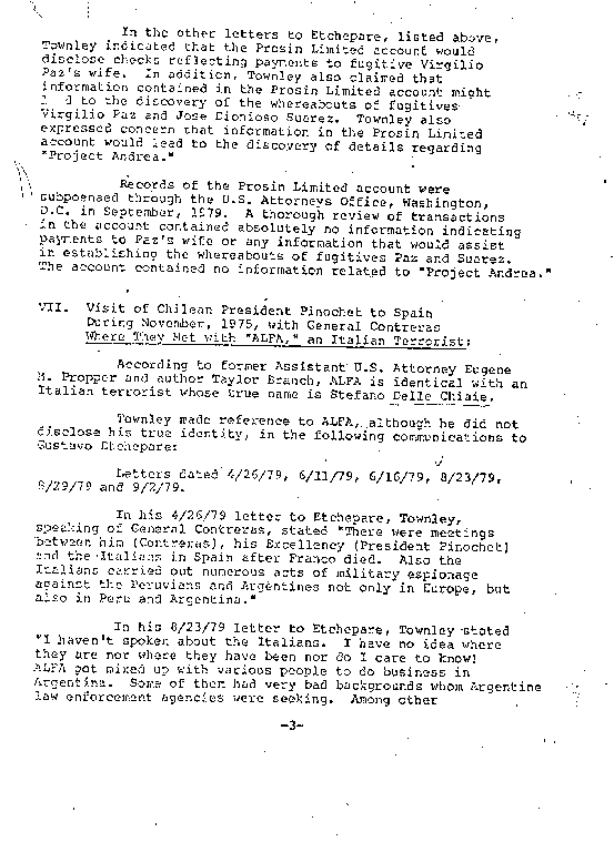 In his 8/23/79 letter to Etchepare, Townley stated "I haven't spoken about the Italians. I have no idea where they are nor where they have been nor do I care to know! ALFA got mixed up with various people to do business in Argentina. Some of them had very bad backgrounds whom Argentine law enforcement agencies were seeking. Among other                                                                     -3-