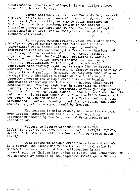 In numerous communications, which are listed below, Townley expressed concern that the "Italians" and the "Argentines" would submit Letters Rogatory seeking information from him concerning the Prats assassinations and the attempted assassination of the Leightons. Townley expressed fear that the "Italians," specifically ALPHA, and General Contreras would provide information concerning the attempted assassination of the Leightons which would contradict what Townley might say in responding to Letters Rogatory from the Italian Government, thereby placing Townley in the position of perjuring himself. Townley expressed similar concern that unidentified elements of one of the Argentine security services and Enrique Arrancibia would furnish information concerning the Prats assassination, which would contradict what Townley might say in responding to Letters Rogatory from the Argentine Government, thereby placing Townley in the position of perjuring himself. Townley concluded that the solution to his dilemma would be to take the Fifth Amendment in responding to Letters Rogatory from the Italian and Argentine Governments. However, Townley noted that by taking the Fifth Amendment, guilt on his part would be implied.