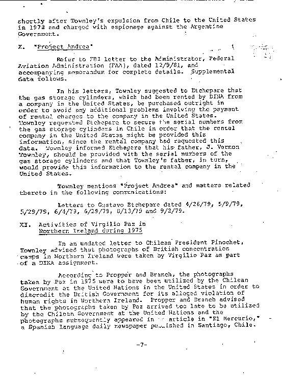 In an undated letter to Chilean President Pinochet, Townley advised that photographs of British concentration camps in Northern Ireland were taken by Virgilio Paz as part of a DINA assignment.