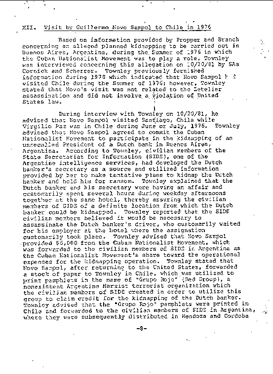 During interview with Townley on 10/20/81, he advised that Novo Sampol visited Santiago, Chile while Virgilio Paz was in Chile during June or July, 1976. Townley advised that Novo Sampol agreed to commit the Cuban Nationalist Movement to participate in the kidnapping of an unrecalled President of a Dutch bank in Buenos Aires, Argentina. According to Townley, civilian members of the State Secretariat for Information (SIDE), one of the Argentine intelligence services, had developed the Dutch banker's secretary as a source and utilized information provided by her to make tentative plans to kidnap the Dutch banker and hold him for ransom. Townley explained that the Dutch banker and his secretary were having an affair and customarily spent several hours during weekday afternoons together at the same hotel, thereby assuring the civilian members of SIDE of a definite location from which the Dutch banker could be kidnapped. Townley reported that the SIDE civilian members believed it would be necessary to assassinate the Dutch banker's driver, who customarily waited for his employer at the hotel where the assignation customarily took place. Townley advised that Novo Sampol provided $6,000 from the Cuban Nationalist Movement, which was forwarded to the civilian members of SIDE in Argentina as the Cuban Nationalist Movement's share toward the operational expenses for the kidnapping operation. Townley stated that Novo Sampol, after returning to the United States, forwarded a stock of paper to Townley in Chile, which was utilized to print pamphlets in the name of "Grupo Rojo" (Red Group), a nonexistent Argentine Marxist terrorist organization which the civilian members of SIDE created in order to utilize this group to claim credit for the kidnapping of the Dutch banker. Townley advised that the "Grupo Rojo" pamphlets were printed in Chile and forwarded to the civilian members of SIDE in Argentina, where they were subsequently distributed in Mendoza and Cordoba                                                     -8-