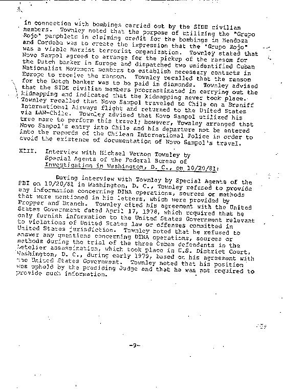 During the interview with Townley by Special Agents of the FBI on 10/20/81 in Washington, D.C., Townley refused to provide any information concerning DINA operations, sources or methods that were mentioned in his letters, which were provided by Propper and Branch. Townley cited his agreement with the United States Government dated April 17, 1978, which required that he only furnish information to the United States Government relevant to violations of United States law or offenses committed in United States jurisdiction. Townley noted that he refused to answer any questions concerning DINA operations, sources or methods during the trial of the three Cuban defendants in the Letelier assassination, which took place in U.S. District Court, Washington, D.C., during early 1979, based on his agreement with the United States Government. Townley noted that his position was upheld by the presiding Judge and that he was not required to provide such information.                                                                                    -9-