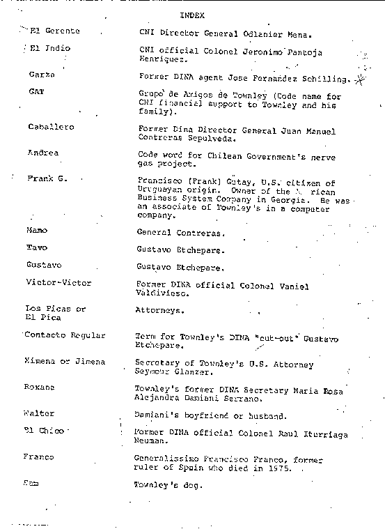 Canario -- Identity unknown. Apparently involved in a computer business in Santiago, Chile at the University of Chile with Townley.                                                                                                                      -3-