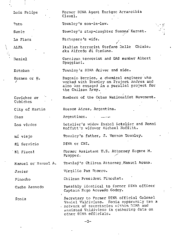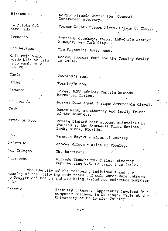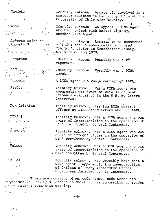There are numerous other code names, code words and phrases in Townley's letters to which it was impossible to render any interpretation or meaning.                                                                                       -4-