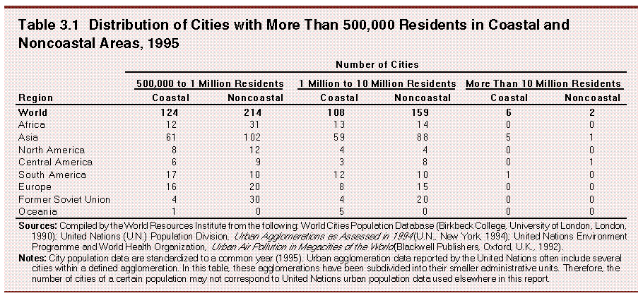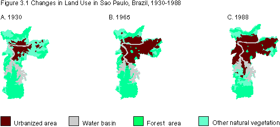 World Resources 1996-97 (A joint publication by The World Resource Institute, The United Nations Environment Programme, The United Nations Development Programme, and the World Bank) (Data edited by Dr. Róbinson Rojas) 3. Urban Impacts on Natural Resources LAND CONVERSION Although cities represent a dramatic transformation of the natural landscape, the total amount of land dedicated to urban uses is small--just 1 percent of Earth's total land surface, according to several estimates (21). Overall, far more natural lands are lost to agricultural activities, forestry, and grazing than to urbanization. Urbanization may actually help to reduce the scale and severity of environmental impacts on land from population growth. High residential densities can reduce land pressures in countries experiencing rapid population growth. Households in villages and rural areas in the Republic of Korea, for example, consume six times more land per capita for residential purposes than households in Seoul (22). Although the amount of land converted to urban uses may be small globally, a trend is emerging in both developed and developing countries: cities from Los Angeles to Jakarta, Indonesia, are rapidly expanding outward, consuming ever greater quantities of land (23). This urban sprawl, characterized by low-density development and vacant or derelict land, leads to the wasteful use of land resources, higher infrastructure costs, and excessive energy consumption and air pollution because of the greater use of motorized transport. Many criticize urban sprawl for aesthetic reasons as well. The United States provides an apt example. Urban population growth there has slowed to less than 1.3 percent per year (24), yet urban development continues to encroach on surrounding lands as residents abandon inner cities and move to the suburbs. The total amount of land dedicated to urban uses increased from 21 million hectares in 1982 to 26 million hectares in 1992. In one decade, 2,085,945 hectares of forestland, 1,525,314 hectares of cultivated cropland, 943,598 hectares of pastureland, and 774,029 hectares of rangeland were converted to urban uses (25). Land pressures are even greater in developing countries with high rates of urban population growth. The physical size of cities in developing countries is expected to double between 1980 and 2000 (26). A round certain cities, urban land expansion is occurring even faster. In Sao Paulo, Brazil, the urban core grew from an area of 180 square kilometers in 1930 to more than 900 square kilometers in 1988. (See Figure 3.1.) The metropolitan region is even larger, covering an astounding 8,000 square kilometers (27). Prime agricultural land and forestland have been converted to urban uses, and development is beginning to move onto steep slopes, which include some of the region's last remaining reserves of natural vegetation (28). Urban expansion is also threatening the local watershed: an estimated 1 million squatters now live in protected watershed areas, and wetlands located next to rivers are covered by streets and housing (29). The example of Sao Paulo shows that it is not necessarily the scale of urban land conversion that is so important as the type of land being lost. Where a city is located is a major determinant of its environmental impact, and--for historical reasons--cities are often located on prime agricultural land or valuable ecosystems near rivers, lakes, or coasts. Estimates suggest that 476,000 hectares of arable land in developing countries is being transformed annually to urban uses (30). To compensate for this loss of land, crop production on the remaining lands may become more intense and potentially more environmentally damaging (31). Urban development can push agriculture to less suitable land, with unintended results. In Canada, for instance, replacing the food production from 1 hectare of prime Ontario farmland lost to urban growth requires about 3 hectares of prairie land, thus increasing the rate of land conversion overall (32). As agriculture moves farther from the city, the transportation of food to the city incurs added energy and pollution costs (33). For countries with little unused arable land, such as China and Egypt, the loss of productive farmland may threaten food security (34). For most rapidly developing cities, however, the loss of agricultural land may not constitute a serious problem, because in part it reflects the lower value of agricultural land relative to that of urban land (35). A greater long-term threat than the loss of agricultural land may be urban encroachment onto fragile ecosystems as a result of intense land use pressures and poor land use planning (36). Squatter settlements are commonly found on steep hillsides vulnerable to landslides and soil erosion, on water catchment areas, on protected lands, and on land subject to flooding or tidal inundation. Although the poor are aware that their settlements lie in precarious locations, the lack of alternative land for housing leaves them no choice. The impacts are twofold: damage to the local environment and threats to the health and well-being of the residents who live there. In Rio de Janeiro, Brazil, favela dwellers (residents of squatter settlements) who live on the steep slopes surrounding the city disturb the natural vegetation and destabilize the hillside soils, leading to intensified mudslides that claim hundreds of lives and that leave thousands of people homeless each year (37). Natural areas are also sacrificed to formal urban development, such as residential estates, industry, and tourism (38). Forests, wetlands, and other ecosystems serve important functions--for instance, species habitat or flood control--but these benefits can seem "intangible" compared with the benefits of urban development. Urban land use planning can help guide urban development away from vulnerable ecosystems. Such policies will not work, however, unless cities also provide adequate land for 