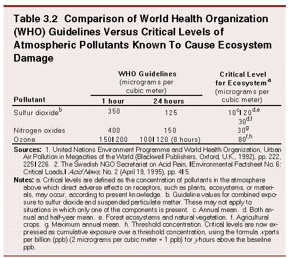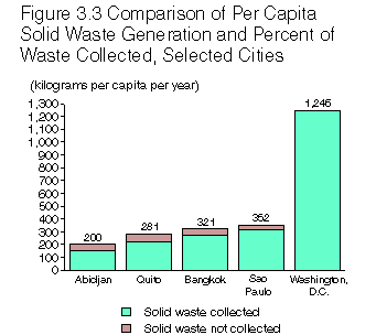 World Resources 1996-97 (A joint publication by The World Resource Institute, The United Nations Environment Programme, The United Nations Development Programme, and the World Bank) (Data edited by Dr. Róbinson Rojas) 3. Urban Impacts on Natural Resources URBAN WASTES The increased levels of consumption characteristic of the populations of urban areas lead to the generation of copious quantities of wastes. The impacts of this pollution are experienced both locally and at great distances from the source. Domestic and industrial discharges contaminate air, land, and water with nutrients and toxics. In turn, degraded air, land, and water harm flora and fauna. Much of this pollution stems from economic growth and industrialization rather than urbanization per se. Cities, however, concentrate these wastes in one place, straining the ability of local ecosystems to assimilate them. Wetlands, for example, can render small quantities of domestic sewage harmless, yet they are no match for vast quantities of urban sewage. Urbanization itself reduces the assimilative capacity of the environment by removing vegetation, slowing the flows of air and water, generating heat, and reducing the infiltration capacity of the land (102). This section looks at only a few aspects of pollution: air pollution, especially the formation of urban ozone; municipal solid waste; and water pollution, in particular, the problem of urban sewage. Urban Air Pollution Despite the potential for energy efficiency in cities, urban energy demand and fossil fuel consumption continue to grow. Already, the concentrations of airborne pollutants in and around cities far exceed those in rural areas. In addition to their toll on human health, these air pollutants can damage terrestrial and aquatic ecosystems. Not all of this damage can be attributed to urban activities. Nonetheless, sources of emissions are concentrated in or around urban areas--especially in developing countries, where industries still tend to be located in cities. In addition, combustion of the fossil fuels used for urban transportation is playing an ever greater role in air pollution problems. (See Box 3.2.) Air quality standards are typically set with human health in mind, but some forms of ecosystem damage can occur at far lower levels. Table 3.2 compares health-based standards with the levels at which ecosystem damage has been documented. In most northern European cities, for example, sulfur dioxide concentrations rarely exceed World Health Organization guidelines, yet sulfur deposition still exceeds the levels at which ecosystem damage can occur. In fact, some efforts to reduce the health effects of urban air pollution in developed countries have actually increased damage to ecosystems. The tall smokestacks built to disperse pollutants in cities such as New York, Philadelphia, and Pittsburgh in the United States ultimately contributed to the acidification of lakes in the Adirondack Mountains (103). In most developed countries, however, stringent pollution control laws and new technologies have reduced sulfur emissions dramatically since the 1950s. In China, where urban use of high-sulfur coal for cooking and domestic heating is common, urban emissions of sulfur dioxide--a precursor to acid rain-- may double or even triple over the next two or three decades (104). Already, damage to aquatic and terrestrial ecosystems has been documented downwind from most Chinese cities. In the Wanxian District downwind from the city of Chongqing, 26 percent of a 65,000-hectare pine forest has died, at least in part because of air pollution. Extensive soil acidification in the region has caused damage to farm produce and a drop in harvest yields (105). Urban Ozone Whereas in most regions of the world problems related to acid deposition stem more from industrialization than urbanization, ground-level ozone--which damages both human health and vegetation--is a distinctly urban problem. The combination of cars, pollutants, and meteorological conditions unique to cities is key to ozone formation. Ozone levels seem certain to increase as the number of cars (a primary source of the pollutants that produce ozone)in cities continues to climb. Urban ozone is a particularly difficult problem to address because no one polluter actually emits it. Ozone is produced when nitrogen oxides, carbon monoxide, and hydrocarbons react with sunlight, a process that takes 8 to 10 hours. In addition to cars, other sources include the production and use of organic chemicals, the use of natural gas, municipal waste disposal, and wastewater treatment plants. The greatest damage to ecosystems from urban ozone often occurs many kilometers from the city itself, although inversion layers can trap ozone within city limits and cause health problems there as well. Plumes downwind of large North American cities can have ozone concentrations of between 70 and 200 parts per billion, often over distances of several hundred kilometers (106) (107). Ozone concentrations as low as 40 parts per billion can injure plant leaves, whereas exposure to concentrations of 60 to 100 parts per billion for several hours is sufficient to cause significant plant, tree, and crop damage (108). Once injured by ozone, plants are more susceptible to insect attack, root rot, and other diseases. In the United States, ozone is responsible for most of the crop yield losses from air pollutants (109). In addition, ozone has been implicated in the declines in the numbers of ponderosa and Jeffrey pines in the San Bernardino National Forest east of Los Angeles, where daytime average ozone concentrations of 100 parts per billion are typical during the summer months, and in the white pine in the eastern United States, downwind from the urban industrial centers in New York and New Jersey (110). The decline in the numbers of trees near Los Angeles sends an important message to other expanding cities. Without policy interventions, ozone will become a pro