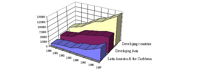 Between 1995 and 1997, FDI flows to Latin America and the Caribbean grew from US$33,006 million to US$65,199 million. This spectacular increase meant that 45% of the FDI received historically in the region by 1997 arrived during the previous seven years. Despite the Asian crisis, estimates for 1998 are that FDI inflows will be of the same order of magnitude as last year.