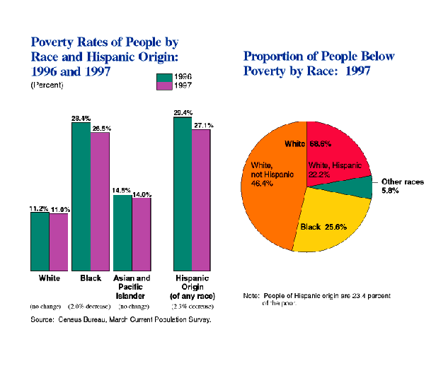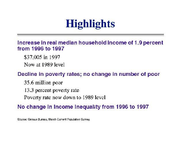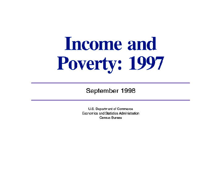 Income and Poverty 1997 PRESS BRIEFING ON 1997 INCOME AND POVERTY ESTIMATES Dr. Daniel H. Weinberg Chief, Housing and Household Economic Statistics Division U.S. Census Bureau September 24, 1998 Welcome to the press briefing on the 1997 income and poverty estimates. Your press packets contain a press release, a copy of my remarks, a copy of the charts I will be using today, and the two reports we are releasing. Additional unpublished detailed tables can be obtained from the Census Bureau directly or on our web site. Let me introduce some of the analysts who worked on the reports; they will be available to answer your questions after the briefing: Charles Nelson (Assistant Division Chief), Mary Naifeh (Acting Chief of the Poverty and Health Statistics Branch), Edward Welniak (Chief of the Income Statistics Branch), and the primary authors of the reports, Robert Cleveland, Joe Dalaker, Carmen DeNavas-Walt, and Arthur Jones. I'd also like to thank all the Field Representatives who work so hard to collect these data. Please hold your questions unless it's a technical clarification. The main presentation should take about 20 minutes. Let me first summarize the main findings. Increases in income and declines in poverty were widespread in 1997. For the third consecutive year, households in the United States experienced an annual increase in their real median income. Between 1996 and 1997, median household income adjusted for inflation increased 1.9 percent, to $37,005 (that means that half of households had incomes above $37,005). In addition, the poverty rate fell from 13.7 percent in 1996 to 13.3 percent in 1997. Despite this increase in income, however, the number of poor remained statistically unchanged -- the number of poor in 1997 was 35.6 million people. In statistical terms, both median income and the poverty rate have returned to their 1989 levels. Finally, there was no change in income inequality from 1996 to 1997. Data from the March Supplement to the Current Population Survey or CPS are the basis for these statistics. The CPS is a sample survey of approximately 50,000 households nationwide, conducted each month for the Bureau of Labor Statistics. These data reflect 1997 and not current conditions. As in all surveys, the data in these reports are estimates, subject to sampling variability and response errors. All statements made in the reports and in this briefing have been tested statistically. All historical income data are expressed in 1997 dollars and were adjusted using the Consumer Price Index; inflation was 2.3 percent between 1996 and 1997. The poverty thresholds are updated each year for inflation as well; for a family of four in 1997 the threshold was $16,400, for a family of three, $12,802. This chart presents the key estimates of median household income. As I noted earlier, median income for all U.S. households rose 1.9 percent or $700 between 1996 and 1997 to $37,005. Households in all regions except the Northeast experienced a significant increase in income. After adjusting for inflation, median household income is now equal to its 1989 level, the most recent business cycle and income peak. Overall, median household income has risen 17.2 percent since 1967, the first year median household income was computed. The poverty rate for all persons declined significantly by one-half a percentage point, from 13.7 percent in 1996 to 13.3 percent in 1997.(1) The number of poor did not change statistically from 1996 to 1997. Despite the overall reduction in the U.S. poverty rate, there was no statistically significant change in any region. The number of poor is now 3.2 million above the 1989 level when 32.4 million people were poor and the poverty rate was 13.1 percent. However, the number of poor is now 3.7 million people below its most recent peak of 39.3 million in 1993. This next chart presents the changes in real median household income by race and ethnicity between 1996 and 1997. Households with a White householder had a 2.5 percent increase in income, those with a Black householder had a 4.3 percent increase, and those with an Asian or Pacific Islander householder had no significant increase. Households with a Hispanic householder, who may be of any race, had a 4.5 percent increase in median income between 1996 and 1997.(2) Per capita income showed an increase between 1996 and 1997 only for Whites among the race groups, and also for Hispanics. As this next chart shows, there was a different pattern for poverty by race and ethnicity than for income. Blacks experienced a decline in their poverty rate by 2.0 percentage points, down to 26.5 percent. Similarly, Hispanics experienced a decline in their poverty rate by 2.3 percentage points, down to 27.1 percent, which was not statistically different from the rate for Blacks. Compared to the overall poverty rate of 13.3 percent, both poverty levels remain high. Nevertheless, as this pie chart shows, more than two-thirds of all poor are White and 46 percent of all poor are non-Hispanic Whites. Children are 40 percent of the poor though they are but 26 percent of the total population. Their poverty rate is higher than for any other age group, 19.9 percent in 1997, unchanged from 1996, but down from its recent peak of 22.7 percent in 1993. Poverty for children has been at or above 20 percent since the early 1980's. The real median earnings of men who worked full time, year round increased by 2.4 percent between 1996 and 1997, while that for comparable women rose by 3.0 percent.(3) This was the first year that full-time year-round male workers experienced an increase in their median earnings since 1991. The ratio of female-to-male earnings for full-time year-round workers remained at its all-time high, 74 percent.