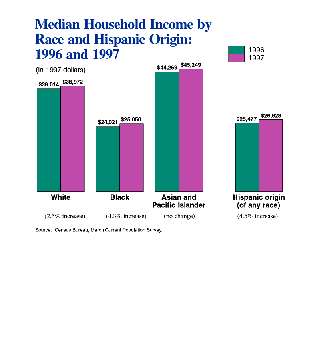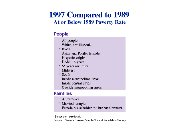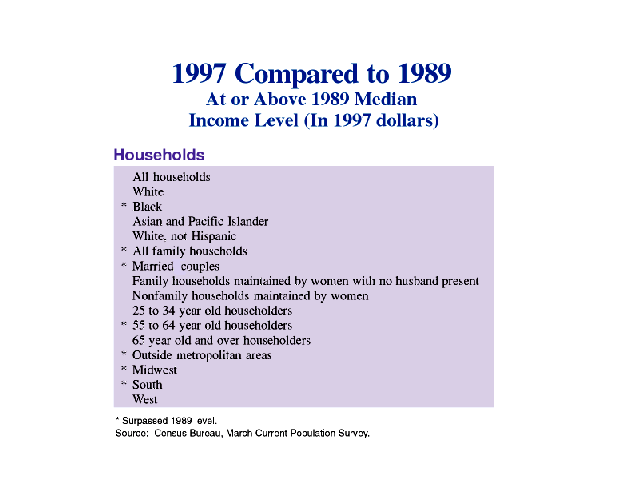 As I mentioned earlier, increases in income and declines in poverty were widespread in 1997. As a result, statistically speaking many population groups have reached or surpassed their 1989 peak levels.
