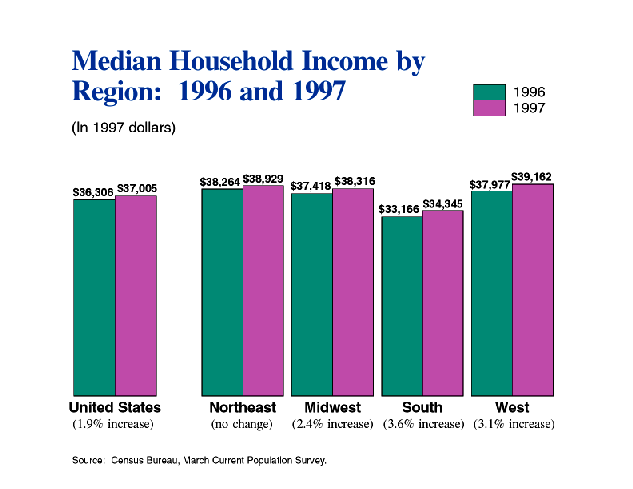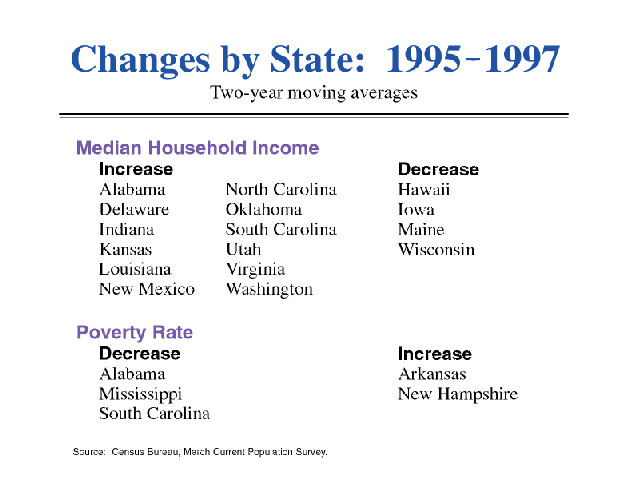 Those whose poverty rates are below their 1989 level are Blacks, the elderly, those in the Midwest and the South, and married-couple families. It is clear that the economic recovery to 1989 levels is quite widespread. The most notable group whose recovery seems to have been delayed is households and individuals in the Northeast. They however had the largest increase in median household income in the 1980s of any region. This is the fourth consecutive year in which there was no year-to-year change in overall income inequality -- there was no statistically significant change in quintile income shares between 1996 and 1997 nor did the Gini index of inequality show a change between 1996 and 1997. Based on a comparison of two-year moving averages, real median household income increased between 1995 and 1997 for twelve states and fell for four.