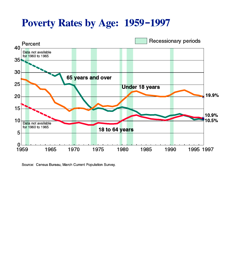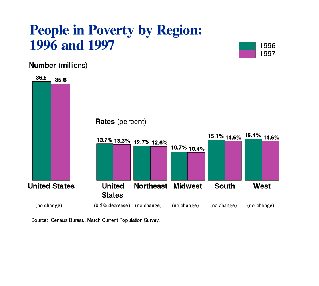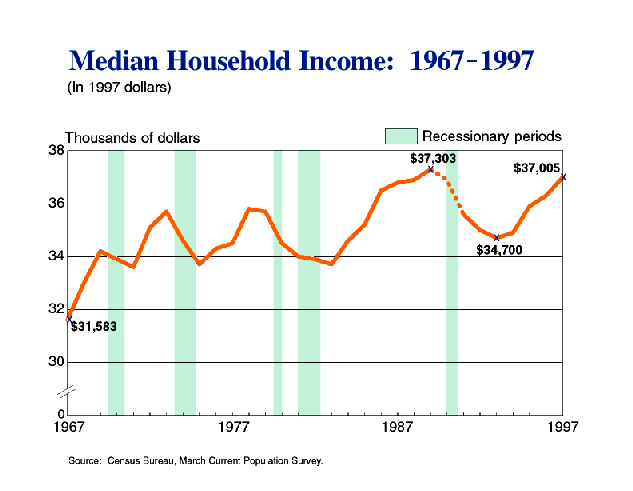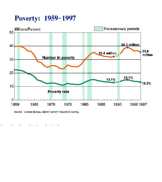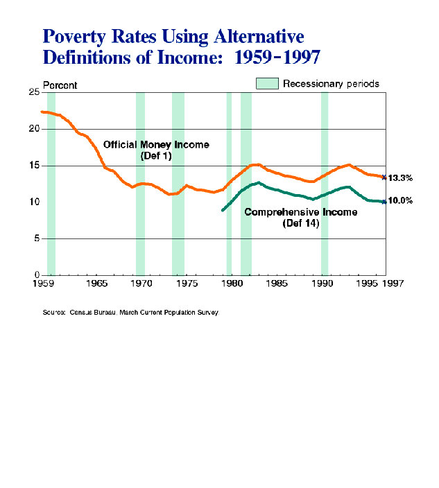 In the same period, three states had a drop in their poverty rate while two showed an increase. The Census Bureau also produces a series of experimental estimates of income, in an attempt to gauge the effect on income and poverty of noncash benefits and taxes, which are not considered in the official measures. Seventeen experimental definitions of income are computed, and tables based on those results are presented in the reports. The Bureau's research in this area has shown that the distribution of income is more equal under a broadened definition that takes into account the effects of taxes and noncash benefits than under the official cash income definition. Government benefits play a much more equalizing role on income than do taxes. Valuing noncash benefits and subtracting taxes also affects the estimated poverty rate. Under the broadened definition of income, the estimated poverty rate was 10.0 percent or 26.9 million people, compared to 13.3 percent and 35.6 million people under the official income definition. Regardless of the method chosen to measure income, as you can see in this chart, the pattern of change in poverty over time is similar. Census Bureau and the Bureau of Labor Statistics researchers are examining the recommendations of a recent National Academy of Sciences panel for changing the official poverty definition. We expect to release a special report on the effects of these recommendations on poverty measures this Spring. You can follow our progress on a special "Poverty Measurement" web site: [http://www.census.gov/hhes/www/povmeas.html]. In the past, we have usually released information on health insurance coverage at this press conference as well. That information is available in a press release to be sent this afternoon under embargo until next Tuesday. Let me call to your attention that this is the fiftieth anniversary of income data from the Current Population Survey. The Census Bureau will release a special report at a press conference next Tuesday to mark the occasion. We have invited a panel of four distinguished economic experts to comment on the usefulness of these data for understanding our economy and society. The panelists are Katharine Abraham, Commissioner of the Bureau of Labor Statistics; Alan Blinder, Professor of Economics at Princeton University; Marvin Kosters, Resident Scholar at the American Enterprise Institute; and Charles Schultze, Senior Fellow Emeritus at the Brookings Institution. Let me again summarize the main findings. For the third consecutive year, households in the United States experienced an annual increase in their real median income. Between 1996 and 1997, median household income adjusted for inflation increased 1.9 percent, to $37,005. In addition, the poverty rate fell from 13.7 percent in 1996 to 13.3 percent in 1997. Despite this increase in income, however, the number of poor remained statistically unchanged -- the number of poor in 1997 was 35.6 million people. Finally, there was no change in income inequality from 1996 to 1997. I'll be glad to answer questions from the press at this time. Please identify yourself and your affiliation. 1. The difference rounds to 0.5 even though the difference in the rounded percentages for the two years is only 0.4. 2. The differences among the 1996-1997 percent changes in median household income for the race and Hispanic origin groups were not statistically significant. 3. The difference between the percent increases in the earnings of men and women was not statistically significant. ---------Contact the Housing and Household Economic Statistics Division at 301-457-3242 or mail to hhes-info@census.gov for further information.--------- Go to Income 1997 Go to Income Statistics Last Revised: Monday, 17-May-99 10:59:54 |