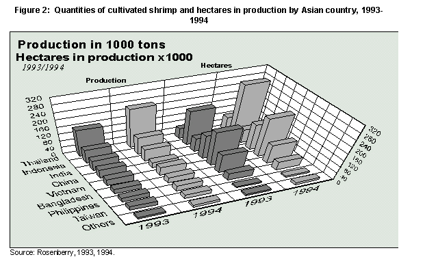 About 80 per cent of world cultured shrimp come from Asia. Between 1993 and 1994 Asia has increased its production from 477,000 metric tons (heads-on) to 585,000 metric tons, with an increase in area of about 170,000 hectares to reach a total exceeding one million hectares (Rosenberry, 1993 and 1994a). The decline in production in 1993 was largely due to disease outbreaks damaging two thirds of the Chinese shrimp crop and also affecting many Indonesian and Ecuadorian shrimp farms. The main reasons for the disease outbreak were polluted waters, dense use of coastal areas for semi-intensive and intensive production and fragile shrimp due to over-medication and overstocking. China's production difficulties continued in 1994, but overall Asian production increased between 1993 and 1994 by about 20 per cent (Rosenberry, 1994a).