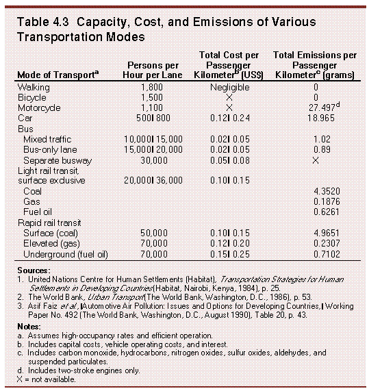 World Resources 1996-97 (A joint publication by The World Resource Institute, The United Nations Environment Programme, The United Nations Development Programme, and the World Bank) (Data edited by Dr. Róbinson Rojas) 4. Urban Transportation Improving the Transportation SupplyEven though mechanisms such as road pricing may be able to reduce travel demand, there is still a considerable need to expand the transportation infrastructure in many rapidly growing urban regions, particularly in the developing world. In many urban areas, the transportation infrastructureincluding roads, sidewalks, crosswalks, and railwaysis seriously deficient. Poor road surfaces lead to safety hazards, congestion, and premature vehicle aging, as well as increased fuel consumption, pollution, and maintenance costs. The challenge, however, is to expand and improve the transportation supply in such a way that the automobile is only one part of the transportation system rather than the focus. Tools for discouraging the overreliance on privately owned cars will not work unless people are given fast and efficient transportation alternativeswhether bus, light rail, subway, walking, or cycling. Indeed, travel patterns in a city mirror that city's commitment to providing roads, parking, and transit service (126). Public Transit Expansion For cities in need of expanding their transportation supply, developing a mass transit system, with its effective use of space and lower per-passenger pollution levels, should be a priority option. (See Table 4.3.) From buses that provide flexible and low-cost transportation to subways, cities have a wide array of choices. The options best suited to a particular city depend on a number of factors, including urban form, density, and wealth. Buses. In most cities, efficient bus systems can be both affordable and effective. Buses can carry as many as 80 passengers during the peak period (and trams can carry even more), yet they take up the space of no more than two privately owned cars (127). Indeed, buses are the transportation choice of a majority of city dwellers in developing countries, especially the urban poor. In 1980, an estimated 600 million trips per day were being made in buses in cities in the developing world; that figure will double by the year 2000 (128). Yet, despite its vital role, bus service in many places falls far short of demand; systems are often severely overstretched, uncomfortable, and unreliable. Potential passengers increasingly turn to other modes of transportation (especially as incomes rise and cars become an option) or are forced to walk long distances. Buses also tend to be noisy and polluting. Regular maintenance can help improve their safety and reduce emissions. In some cities, buses have been retrofitted with engines that run on compressed natural gas (129). As long as buses run on the same congested streets as other vehicles, they will never be an attractive alternative for those who can afford a car. An effective way to increase bus ridership is to give buses priority in traffic. A dedicated bus lane (assuming high-occupancy rates and efficient operation) can move twice as many people per hour as buses operating in mixed traffic and 40 times as many people per hour as cars (130). By giving buses priority over car traffic, more people will turn to buses as a fast and efficient alternative (131). Many European cities, including Zurich and Helsinki, Finland, have designed systems that give priority to buses and trolleys at intersections (132). In Abidjan, Cote dIvoire, a system combining exclusive bus lanes with a high-speed bus network has enjoyed considerable success. It not only cut bus trip times in half and relieved congestion, but also enabled the government to postpone planned infrastructure investments of US$120 million between 1981 and 1984 (133). One of the most effective bus systems is in Curitiba, Brazil, where the integration of guided land development and a public transportation network created conditions that naturally promote bus use (134). In Canada, the city of Ottawa, Ontario, is developing an extensive busway system rather than a subway system because of its comparatively low cost and flexibility in serving low- to medium-density urban areas. In addition to exclusive bus lanes, the city is considering a bus tunnel in part of the city center and will promote the use of alternative fuels, including compressed natural gas and electricity, to help alleviate related emissions problems. The system has been designed so that it could be converted to rail transit if warranted (135). Rail Transit. Well-planned and well-used light rail systems can move more people than can buses. Light rail systems also consume less energy than buses and, depending on the power source, emit fewer pollutants (136). Light rail systems, such as trams and trolleys, although slower than heavy rail systems, can carry 6,000 people per hour in mixed traffic and up to 36,000 people per hour with five- or six-car trains, exclusive rights-of-way, and grade-separated intersections (137). Light rail systems have certain drawbacks, including system inflexibility and expensive track maintenance (138). However, in the dense cities of Asia, light rail is becoming increasingly attractive and viable (139). Rapid rail transit, such as subways, often appear to be the ideal solution to clogged city streets. These rail systems promise high mobility, can be built under valuable urban land, and, because they emit relatively few pollutants, are an environmentally attractive alternative. Yet, construction and operating costs are huge and often prove to be excessively burdensome on city bud-gets (140). For example, a dedicated underground rail system cost $40 million per kilometer in Santiago, Chile, $64 million in Osaka, Japan, and $117 million in Caracas, Venezuela. In comparison, a surface light rail system in Tunis, Tunisia, cost only $29 million per kilometer (141). Cities should resi