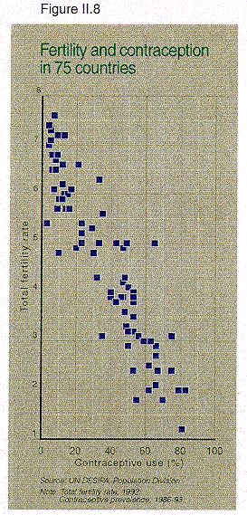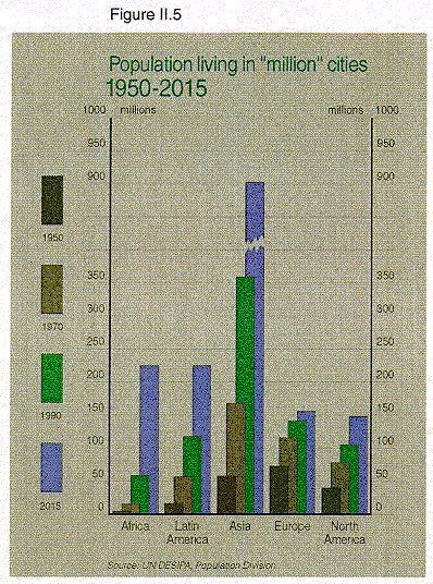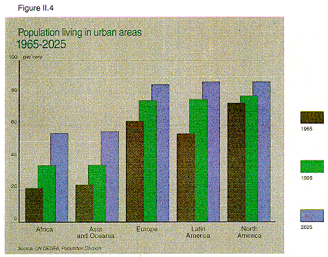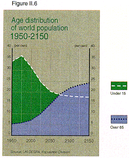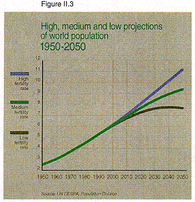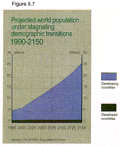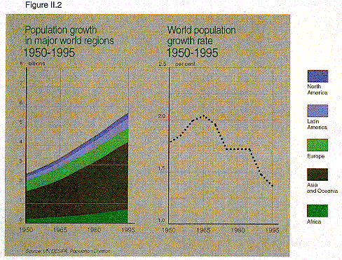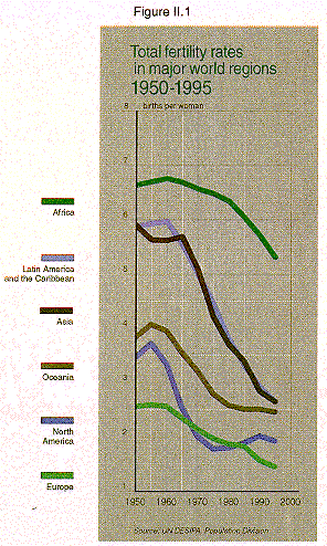 II. TRENDS IN WORLD POPULATION Introduction 18. The 1972 Stockholm Conference took place at the end of two decades in which the world's population soared from 2.5 billion to 3.7 billion - the most rapid growth rate in human numbers ever experienced. Population doubling times for some developing countries were falling below 20 years and some scientists and policy makers in developed countries expressed fears that "the population explosion", if not controlled through vigorous population programmes, would lead to mass starvation and societal breakdown. This view was largely rejected by the Governments of developing countries, and the population issue proved too sensitive even to be included in the Stockholm agenda. 19. Subsequent international population conferences (Bucharest 1974, Mexico 1984 and Cairo 1994) charted the gradual emergence of a more consensual approach to the population issue. By the early 1980s, the "North" had largely accepted the "Southern" argument that population policies should be set more broadly in the context of socio-economic development. Concerns over possible environmental limits to population growth (focusing successively on deforestation, energy, water and climate change) were increasingly debated in scientific and policy communities. These linkages between population and environment slowly became more prominent at the international level: Our Common Future (1987) and Agenda 21 (1992) both explicitly discussed population issues in relation to sustainable development. 20. In 25 years, the population debate has evolved dramatically from a narrow focus on population size and growth rates to a more integrated agenda embracing demographic structures, distribution patterns and urbanization, levels of exploitation of natural resources, and creation of viable agricultural and industrial infrastructures. Policy makers increasingly acknowledge these interlinkages between demographics, environment and economy. At the same time, there is still heated controversy over whether the world's population is on an unsustainable trajectory or not; population data invite conflicting interpretations. The following section explores some key aspects of the global demographic transition and their implications for future policy intervention. The demographic transition 21. The demographic transition is the most widely observed and documented example of the transition concept. Initially, during the pre-development phase, birth and death rates are high and in equilibrium with each other, resulting in slow or no population growth. In the take-off and acceleration phases, the average death rate falls, primarily due to improved health care, the average birth rate remains high and the population grows rapidly. In the stabilization phase, the dominant determinant is a decline in birth rates. In a complete transition, birth rates fall to match the reduction in death rates and a new stable, though much higher, population size is achieved. However, if death rates decrease but birth rates fail to decline to the same extent, the transition "stalls" and total population size continues to increase. 22. As of 1997, the demographic transition has become a historical fact in approximately 30 countries of the world, including all the larger industrialized countries of Europe and Japan. With high life expectancies and growth rates fluctuating around 0.4 per cent a year, their populations are effectively stable. A small number of European countries have negative growth rates and population dynamics in Eastern Europe and the former Soviet Union have been strongly affected by the political and economic transformations experienced since the late 1980s. Fertility rates in the region between 1990 and 1995 were 23 per cent lower than in the previous five-year period. At the same time, mortality rates rose; for example, the average life expectancy of males in the Russian Federation fell sharply, from 65 in 1987 to 57 in 1994.1/ A more varied picture emerges in other regions of the world where population levels are generally rising. However, falling fertility rates are already powerfully evident in Latin America and some parts of Asia. Sub-Saharan Africa has yet to complete the fertility transition, though fertility rates appear to have begun to decline in a number of countries, for example, Madagascar, the United Republic of Tanzania, Namibia, South Africa and Mauritania. For developing countries as a whole, fertility rates are falling rapidly (figure II.1). 23. Overall, the annual growth rate in the world's population has declined from a high of just over 2 per cent in the 1960s to 1.48 per cent in the decade beginning in 1990. The number of people added to the world's population each year (the annual increment) has risen steadily from 47 million in 1950, but is now thought to have peaked at around 81 million in 1995, with population stabilization (an annual increment of 0) expected in 2050. 2/ The population growth rate has fallen more swiftly than demographers expected, because of a faster fertility decline than was previously anticipated. The most recent (1996) United Nations population projections show a significant downward revision of both estimated historical population growth and the size of the world's future population (figure II.2). 24. The combination of declining fertility and accelerating population growth is, in part, the result of previously accumulated "demographic potential", that is, high numbers of young people who are now entering reproductive age. High fertility levels also persist in some parts of the world. Even if fertility rates everywhere were to fall instantly to replacement level (2.06 children per woman), the high proportion of young people "in the pipeline" ensures that world population growth will not be halted for another two generations. 3/ Looking ahead 25. The Conventional Development Scenario (CDS) assumes that developing countries will complete the demographic transition. CDS