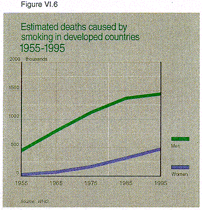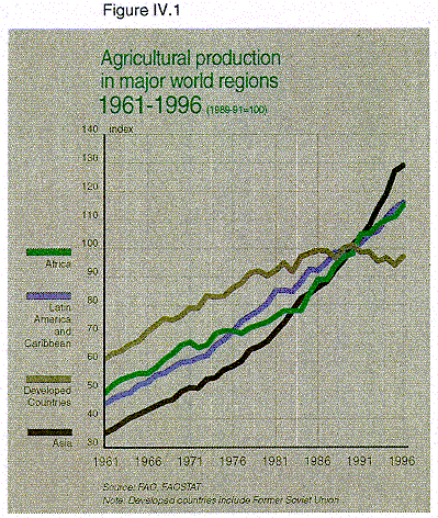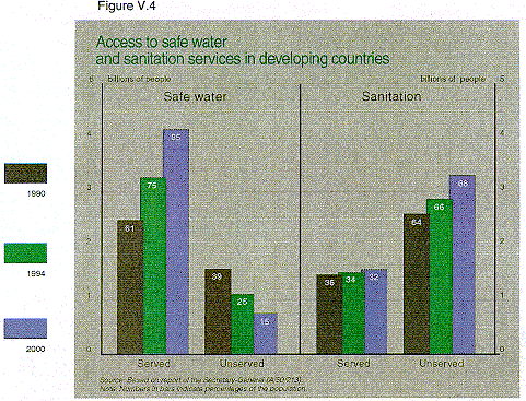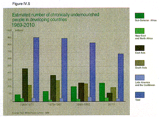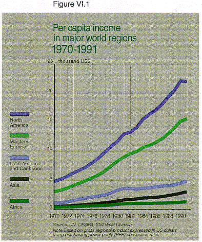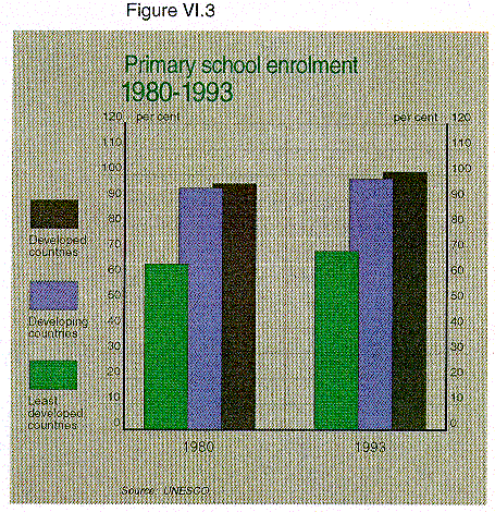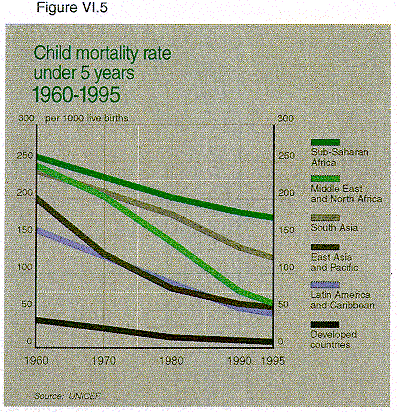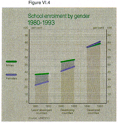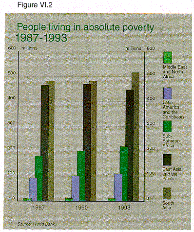 Economic growth and poverty 159. The world economy has grown with unprecedented speed since the Second World War, and growth has been further fuelled in recent years by trade liberalization and greater mobility of private investment capital. Exports of goods and services grew from 17 per cent of the GDP of market economies in 1970 to 24 per cent in 1990. The phenomenon of "globalization" is creating a world economy increasingly interlinked by international and regional trade agreements and the operations of transnational companies, financial institutions, mass media and electronic communications. Global economic growth has led to a real rise in the standard of living for a majority of the world's population though its benefits have not been universal. While some developing regions owe their rapid growth to international trade, others, especially those dependent on exports of primary commodities, appear to be at risk of marginalization. More than 1.5 billion people experienced declining incomes in the 1990s. 3/ (figure VI.1). 160. Poverty is related to a wide range of factors, including income, health, education and access to goods and services, and such socio-cultural factors as gender and ethnicity. If income is used as a proxy measure, it is clear that much progress in reducing poverty has been made in recent decades. Average per capita incomes in developing countries have doubled in the past 25 years (a feat which took nearly 40 years in the United States). Social indicators such as education and health have also improved (see below). The percentage of the world's population living in absolute poverty (defined by the World Bank as living on less than a dollar a day 4/) has fallen since the mid-1980s. However, this decline was concentrated in Asia; other regions have not reduced the incidence of poverty to the same degree and the total number of people living in poverty has risen, to just over 1.3 billion in 1993 (figure VI.2).5/ Efforts to reduce poverty have generally met with greatest success in the developing countries which are more advanced in their economic and demographic transitions. Widespread poverty appears most persistent in countries experiencing continued, rapid population growth and economic stagnation. Education 161. Education is fundamental to reducing both individual and national poverty. School enrolment, especially primary schooling for literacy, is a means to achieving the interlinked development goals of health, higher labour productivity, more rapid economic growth and the broader objective of social integration, for example, through participation in political and cultural affairs. Literacy rates have risen strongly in developing countries, boosted also by adult literacy programmes, but the absolute numbers of illiterate adults has increased from about 760 million in 1970 to about 900 million today. 6/ The proportion of children enrolled in school has also risen, though more slowly. The numbers of children not attending school have fallen in most of Asia and Latin America but have risen in Africa and the least developed countries.(figure VI.3) 162. The level of education among women is increasingly recognized as a major factor in speeding the social transition; higher enrolment rates for girls demonstrably lead to decreased fertility rates, improved child health and increased earnings potential. Female adult literacy and school enrolment at primary and secondary levels increased by almost two thirds in the developing countries between 1970 and 1992, with the fastest progress being made in the Arab States, followed by south-east Asia and Latin America. 7/ Progress has also been made in higher education. Overall, educational attainment among women has progressed faster than among men and the "educational gender gap", though still significant, has narrowed at virtually all levels of education and in all regions. Exceptions are adult literacy and higher education rates in sub-Saharan Africa, where the gaps between men and women have widened. (figure VI.4) Human health 163. Socio-economic development is characterized by a health transition during which infectious diseases, which thrive when people live in unsanitary or overcrowded conditions, give way to degenerative diseases associated with longer life expectancy (for example, cancer) or more affluent lifestyles. Infectious diseases remain the leading cause of death worldwide (about one third of all annual deaths) but dramatic improvements have been made in recent decades. Thanks to targeted political and scientific efforts, killer diseases including poliomyelitis, leprosy, guinea-worm disease and neonatal tetanus are likely to be eradicated in the near future. 8/ Globally, average life expectancy at birth has risen to 65 years and the life expectancy gap between the industrialized and developing countries has approximately halved over the past 40 years. Infant and child mortality rates have fallen in all regions. (figure VI.5) 164. Despite progress, the World Health Organization points to disturbing trends which indicate that infectious diseases are far from under control. During the past 20 years, at least 30 new diseases - for many of which there is currently no treatment or vaccine - have emerged to pose a threat to the health of hundreds of millions of people. Examples include AIDS, which was unknown 20 years ago and has now infected an estimated 24 million adults worldwide, and new varieties of haemorrhagic fevers, of which Ebola is the best known. 8/ Antibiotic resistance in hospitals worldwide is renewing the threat from diseases considered to be subdued. And, in the industrialized countries, "old" diseases such as tuberculosis have re-emerged in many poorer urban areas. Developing countries, meanwhile, are experiencing rapid growth in some degenerative diseases once largely confined to the developed world. Cancers and coronary heart disease are on the increase, especially in middle- income countries, and ma