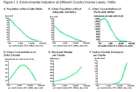 World Resources 1996-97 (A joint publication by The World Resource Institute, The United Nations Environment Programme, The United Nations Development Programme, and the World Bank) (Edited by Dr. Róbinson Rojas) 1. Cities and the Environment URBAN ENVIRONMENTAL PROBLEMS As centers of population and human activities, cities consume natural resources from both near and distant sources. They also generate waste that is disposed of both inside and outside the city. In the process, urban areas generate environmental problems over a range of spatial scales: the household and workplace, the neighborhood, the city, the wider region, and the globe (110). Urban environmental problems also create a range of social impacts. They may impair human health, cause economic and other welfare losses, or damage the ecosystems on which both urban and rural areas depend. Most urban environmental problems entail all three of these impacts, either directly or indirectly. For example, urban air pollution has a direct impact on human health, increasing the incidence of respiratory disease. Its impact on the economy is mainly indirect, arising largely from productivity losses due to ill health (111). Determinants of Urban Environmental Problems Environmental problems vary from city to city and region to region and are influenced by such variables as a city's size and rate of growth, income, local geography, climate, and institutional capabilities. Especially where local governments are weak or underfinanced, rapid economic or population growth can exacerbate th ese problems. Environmental management tends to be more difficult in very large cities. For one, the financial resources needed to provide services to tens of millions of people are daunting. Compounding the d ifficulty is the fact that the largest cities often are made up of many local jurisdictions with overlapping respo nsibilities (112)(113). Income One of the most important determinants of a city's environmental problems is its income level. As the wealth of a city grows, many types of environmental degradation first increase and then eventually diminish. Other environmental problems increase with wealth. (See Figure 1.3.) The income level at which a city undergoes these changes differs widely. Vastly different environmental conditions can be found in cities of comparable wealth. Policies, as well as demography and geography, can make an enormous difference. In poor cities, and particularly their poor neighborhoods, the most threatening environmental problems are usually those close to home (114). The dangers of exposure to environmental risks are high, especially for women and children. Inadequate household water supplies are typically more crucial to people's well-being than polluted waterways. There is often more exposure to air pollution in smoky kitchens than outdoors. Waste accumulating, uncollected, in the neighborhood poses more serious problems than the waste at the city dumps. Human excreta is frequently the most critical pollutant, and unsanitary conditions in the home and neighborhood are generally more of a threat to health than industrial pollution. These problems, so prevalent in cities in the developing world, stem from myriad causes, including the inability or unwillingness of local governments to provide for basic needs of citizens--which in turn stems from a lack of revenue-generating capacity. Another key factor is the poor's lack of access to suitable land for housing. As income increases, urban households and cities as a whole consume far more resources, such as energy, water, and building materials-- and generate far more of certain types of wastes. Yet the rich devote part of their wealth to measures that protect them from environmental hazards. The problems close to home are the first to improve as wealth increases, generally because they are the most threatening and require cooperation on only a relatively small scale. However, while these improvements reduce personal exposure, they often simply shift the problem elsewhere. Waterborne sewage systems, for example, reduce personal exposure to fecal material. However, if sewage is discharged without treatment, it can lower the quality of a city's waterways and strain water supplies. Electricity is a clean fuel where it is used, but electric power plants can be an important source of ambient air pollution. Thus, even as household and neighborhood environmental problems recede from prominence for a growing number of a city's population, citywide and regional problems, such as ambient air pollution, water pollution, and hazardous waste generation, may increase. These problems tend to be severe in rapidly industrializing cities of the developing world and in the transition economies of Central and Eastern Europe, where industrial activity often occurs without adequate concern for its environmental implications. (See Box 1.6.) Lack of investment in urban infrastructure, such as increased road networks and sewage treatment plants, and weak environmental protection laws with lax enforcement, exacerbate these problems. In high-income cities, such as those in Europe and North America, many of the worst city-level problems have been addressed. For instance, many cities in the developed world have improved the quality of their ambient air and water over the past decades. A wealthy city can more easily afford the public finance and administration needed to regulate the more perceptible forms of pollution. But while the ambient environment of high-income cities may actually be more benign in terms of the health impacts of pollution, these cities exert a far greater toll on the regional and global environment. The resources consumed and greenhouse gases emitted to support even the cleanest cities in developed countries are, on a per capita basis, far greater than those associated with the poorer cities of developing regions. Indeed, the largest per capita urban contributors to global environ