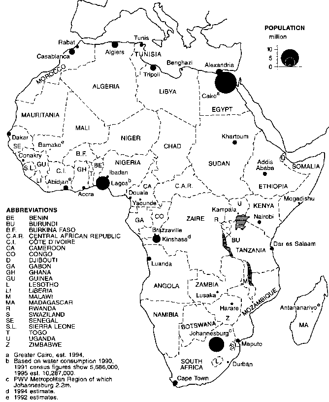 Fig. 1.1 The cities of Africa (Source: 1995 estimates - UN, World Urbanization Prospects, 1994,United Nations Department for Economic and Social Information and Policy Analysis, New York, 1995; exceptions based on relevant chapters from UNCHS, Global Report on Human Settlements, draft, UNCHS, Nairobi, table 4)