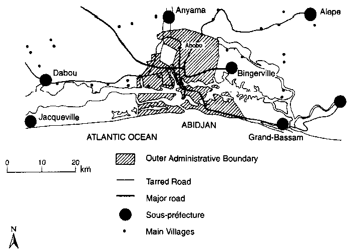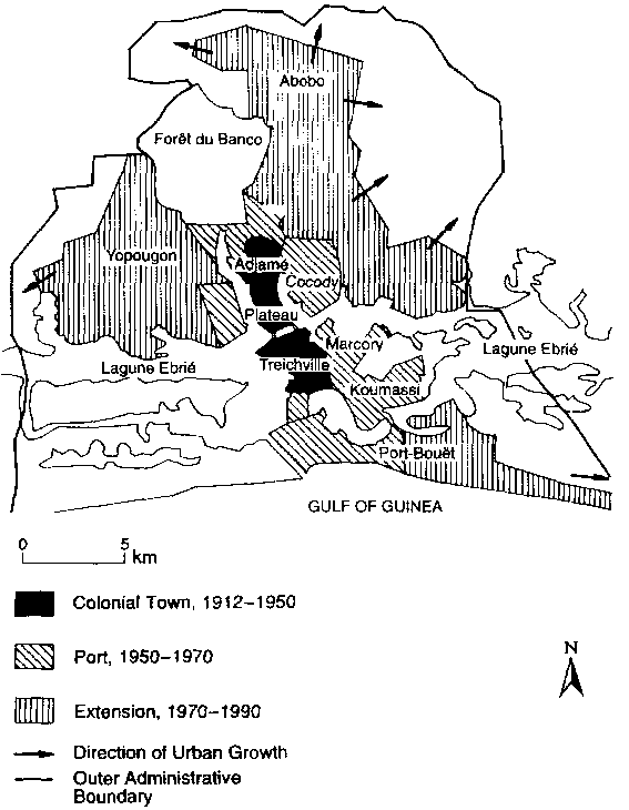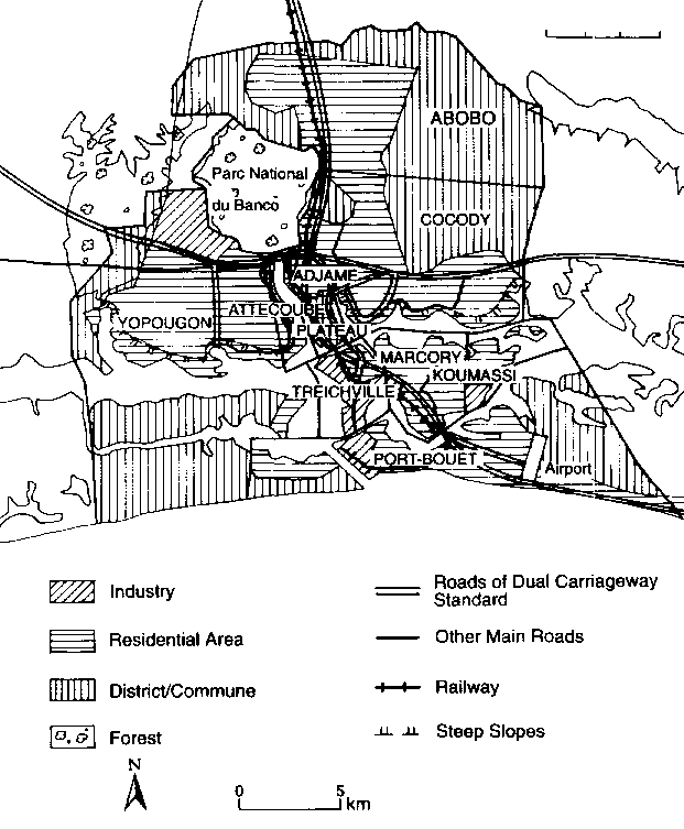 The urban challenge in Africa: Growth and management of its large cities Edited by Carole Rakodi - United Nations University Press - TOKYO - NEW YORK - PARIS - © The United Nations University, 1997 8 Abidjan: From the public making of a modern city to urban management of a metropolis Alain Dubresson Abstract Regroupant aujourd'hui plus de 2.5 millions d'habitants, la métropole abidjanaise a été précocement insérée dans la division internationale du travail. Ville-relais du système colonial, localisée en bordure de l'Océan Atlantique et bénéficiant d'un remarquable site portuaire, Abidjan doit son fulgurant essor démographique à la vigoureuse croissance économique impulsée, durant trente ans, par l'économie de plantation, le modèle agro-exportateur ivoirien et les investissements étrangers. L'édification d'un appareil d'Etat puissant et centralisé a renforcé en permanence le poids de la capitale économique, dont les industries et les services vent articulés au système-monde. Le projet urbain moderniste, indissociable des choix politiques fondamentaux de croissance dans la dépendance, confère à Abidjan une structure unique en Afrique de l'ouest. Le volontarisme public, la planification, la tentation de l'urbanisme intégral ont abouti à la mise en place de remarquables infrastructures de transport et d'un imposant dispositif de maîtrise du sol et de production de logement: à la veille de la récession économique le pare immobilier public regroupait plus de 22 pour cent des citadins. A cet "endroit" du modèle s'oppose cependant un "envers," constitué par les cours communes, forme d'habitat rassemblant toujours la majorité des Abidjanais. Depuis le début des années 80, la crise du modèle agro-exportateur, la raréfaction des ressources financières de l'Etat, les impasses des options urbanistiques et le ralentissement de l'élan démographique ont eu des conséquences considérables sur la dynamique de la ville. Le temps n'est plus aux grands investissements publics mais à la gestion privatisée des services, à la décentralisation et au développement local, nouveaux fétichismes maniés par la Banque Mondiale, devenue le principal interlocuteur de l'Etat, et les organisations non-gouvernementales. Des trots types d'acteurs principaux, l'Etat et les sociétés concessionnaires de services publics, les 10 communes de plein exercice, la "Ville d'Abidjan," entité supra-communale, c'est cette dernière qui a été mise hors-jeu de la gestion urbaine. La décentralisation a des aspects positifs, mais les pouvoirs municipaux ne maîtrisent pas les mécanismes producteurs d'inégalités dans l'ensemble de la ville de sorte que, faute de poser clairement la question des modes et des échelles d'arbitrage et de péréquation, et finalement de la nature des pouvoirs, les écarts entre les communes les plus riches et les plus défavorisées se vent accrue. Par son intérêt et surtout par ses limites, l'expérience abidjanaise montre que l'efficacité du gouvernement de la ville pour le plus grand nombre des citadins repose sur la nécessaire articulation entre la richesse des dispositifs locaux et les ressources d'un système plus global d'encadrement. Introduction With probably more than 2.5 million inhabitants in 1994 (there were 1,934,000 at the 1988 census and the annual growth rate between 1984 and 1988 was 4.2 per cent), Abidjan is the second- or third-largest West African city after Lagos, and perhaps Ibadan, and has all the characteristics of a metropolis. The city hosts more than one-fifth of Côte d'Ivoire's total population, who came in successive waves of migration from every region of the country, as well as from neighbouring states. It is both an inheritance from the colonial past and an economic centre, which has been dynamized by basic development opportunities based on integration into the global market. These opportunities, which have influenced both the settlement's dynamics and the concentration of economic activities, have had a considerable impact on the urban structure and organization. The circumstances and the results are unique in West Africa. Abidjan comprises at present 10 communes (districts) with a total area of 57,735 ha, of which 8,991 ha are lagoons (AUA, 1989), while 17,000 had been urbanized one way or another by 1988. Often referred to as "the pearl of the lagoons," Abidjan is the outcome of a modernist project financed by the vigorous economic growth of the 1960s and 1970s. Recession, a slower population growth rate in the 1980s and 1990s, the financial crisis of the state, which was the main investment player, and the dead end of a far too selective modernization process have changed the urban set-up. The time for large state spending is no more. It has given way to the privatization of services, meant to attract productive investments; to decentralization; and to local development - the latest fetishes of the World Bank and non-governmental organizations (NGOs). Does this mean that the providers of public and centralized services should cease from being necessary stakeholders; or that integrated planning and urban development, which offer some measure of equality and fairness, should be rejected because they cannot be the responsibility of local players and district authorities, particularly in the case of a metropolis? The Abidjan conurbation From colonial stopover to economic centre Inherited from the colonial past: Early involvement in the international division of labour To understand the Abidjan phenomenon, this gathering of people, investments, capital, and assets, it is necessary to recall, however briefly, its colonial past, because the emergence of this urban area is linked to the forging of a tool in the colonial system of exchange, as a means to subordinate the colonial periphery to the needs of the colonial power (Antoine et al., 1987). It derives from the search for a healthy site where Europeans could be saf