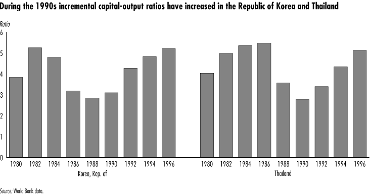 Source: World Bank data. Absorbing large inflows of private capital and deploying them productively presented challenges to economic management. Despite the good macroeconomic track record of the East Asian countries, three sources of vulnerability emerged: large current account deficits and misallocated investment, bad loans and currency and maturity mismatches, and misaligned real exchange rates and lost competitiveness. Large current account deficits and misallocated investment. Although East Asia has high savings rates (averaging more than 30 percent of GDP in Indonesia, Korea, Malaysia, and Thailand during 199396), foreign capital was required to finance its even higher investment rates (which rose to about 40 percent of GDP in Korea, Malaysia, and Thailand and 34 percent in Indonesia during 199396). Still, financial crises result more from a loss of confidence in borrowers ability to repay than simply from the existence of large current account deficits. Indeed, the statistical link between current account deficits and currency crises appears weak (box 2.1). Although (except for Korea) East Asias debt relative to GDP was much higher in 1996 than Latin Americas, its debt relative to exports was generally much lower (figure 2.1). (Only Indonesias debt to exports ratio220 percentmight have been cause for concern.) Thus the size of the external debt-exports ratio was not necessarily a binding constraint on further borrowing. The large share of short-term debt owed by the private sector, however, increased the regions vulnerability to internal and external shocks that could undermine investor confidence. Even where short-term borrowing was used to purchase long-term external assets (so that investors did not have substantial currency exposure), the refusal of creditors to roll over credit lines led to a liquidity squeeze because of the maturity mismatch. The sustainability of large current account deficits partly depends on how the funds are used. If East Asian borrowers had invested the funds in diversified, high-productivity investments, the deficits would have been sustainable. But instead much of the capital inflow (and the coincident surge of domestic investment) appears to have been directed into risky, low-productivity investments. For example, a large portion of domestic credit flowed into nontradables, especially real estate. Market sources report that real estate loans accounted for about 25 percent of outstanding bank loans in Malaysia and the Philippines2 and 20 percent in Thailand. The surge in the regions real estate investments rapidly outpaced demand: by 1996 vacancy rates had reached nearly 15 percent in Bangkok and Jakarta. The poor quality of real estate investment in Thailand was reflected in the stock market, where the index for building and furnishing companies collapsed from a peak of just below 8,200 in late 1994 to 1,100 in late 1997. The concentration of loans in the highly cyclical property market led to asset price bubbles and made the banking system vulnerable to a downturn in domestic demand. And the concentration of bank portfolios in nontradablesalong with currency mismatchesmade them more vulnerable to a depreciation in the currency. More generally, an increase in incremental capital-output ratios in East Asia may reflect the poor quality of a large portion of new investment during the 1990s (box 2.2). Although in recent years the share of investment in GDP rose across East Asia, GDP growth rates remained roughly constant and even fell in some countries. For example, the efficiency of Korean investment declined in the years preceding the crisis, with the share of investment in GDP rising from 30 percent in 198389 to 38 percent in 199596 while GDP growth fell from 10 percent to 8 percent. The increase in the capital intensity of output partly reflected a shift away from labor-intensive sectors (such as garments, footwear, and light assembly) toward what were considered strategic sectors for Korean industrialization (including automobiles and electronics). High capital spending led to overcapacity in many sectors, as the countrys chaebol (industrial conglomerates) pursued investments hoping to build market share both domestically and overseas. To some degree, however, the decline in GDP growth relative to investment could also reflect changes that lowered the return on the capital stocksuch as shifts in international demand for computer chipsrather than a decline in the productivity of new investment. The low productivity of investment and the growing vulnerability of the corporate sector can also be seen in the drop in Korean companies return on assets (to 1 percent in 1996) and the spate of bankruptcies in 1997 (prior to the spread of the crisis to Korea). Similarly, the return on equity in Indonesia, Malaysia, and Thailand declined between 1992 and 1996 to below money market interest rates, indicating that there was no compensation for the risk of investing in these economies. Bad loans and currency and maturity mismatches. Low-productivity investments were reflected in banking systems high nonperforming loans, which according to market sources reached 19 percent of loans in Indonesia, 16 percent in Malaysia, 13 percent in the Philippines, and 17 percent in Thailand in the immediate aftermath of the devaluation.3 Conservative estimates suggest that by the end of 1997 the equivalent of 6.5 percent of GDP was required to restore the capital adequacy of Koreas merchant, commercial, and specialized banks. Some East Asian banking systems were made more vulnerable by the fact that a lot of external borrowing (especially in the past few years) was short term and was used to fund local currencydenominated assets, particularly in real estate and other nontradables. Even when banks avoided currency mismatches, their clients often had significant foreign exchange exposure, so the banks remained vulnerable to a fall in the exchange rate. The extent of currency and 
