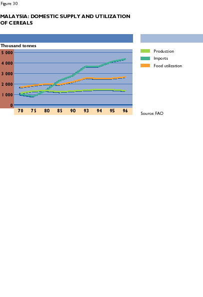 Economic growth has also enabled the country to meet the growing food needs of the population through food imports which, while increasing steadily in volume and value, have corresponded to an ever-declining share of total merchandise export revenues (22 percent in the early 1970s, 13 percent in the early 1980s and about 5 percent in recent years). Thus, the issue of a large and growing food import dependence, which was a matter of concern in many other country circumstances, has not constituted a major economic problem or an obstacle to food security in Malaysia.